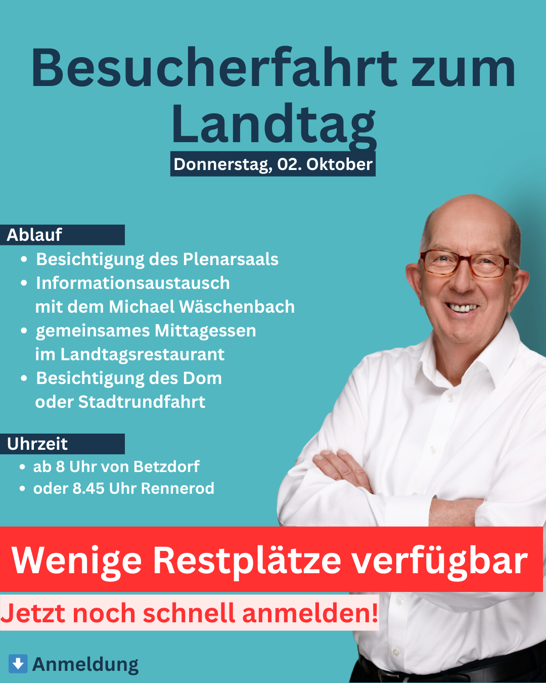 Am Donnerstag, den 2. Oktober 2025, lade ich alle politisch interessierten Bürgerinnen und Bürger herzlich zu einer Besucherfahrt in den rheinland-pfälzischen Landtag nach Mainz ein. Ein besonderer Fokus liegt diesmal auf engagierten Menschen aus der Verbandsgemeinde Rennerod, die sich ehrenamtlich für unsere Gesellschaft einsetzen. Es sind noch Restplätze verfügbar – eine kurzfristige Anmeldung ist möglich. Kostenbeitrag: 15,00 Euro (inkl. Fahrt und Mittagessen) Anmeldung: Da die Teilnehmerzahl begrenzt ist, erfolgt die Vergabe der Restplätze nach Eingang der Anmeldungen. Ich freue mich auf den gemeinsamen Tag, interessante Gespräche und einen spannenden Einblick in die Landespolitik.Besucherfahrt in den Landtag am 2. Oktober – noch Restplätze verfügbar